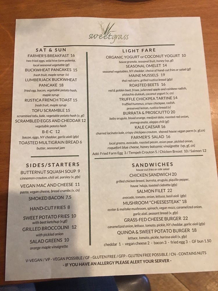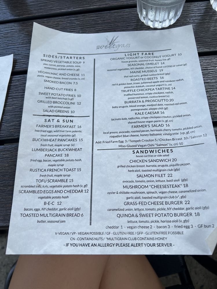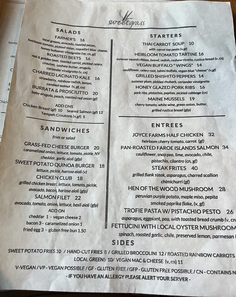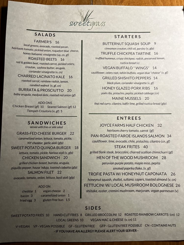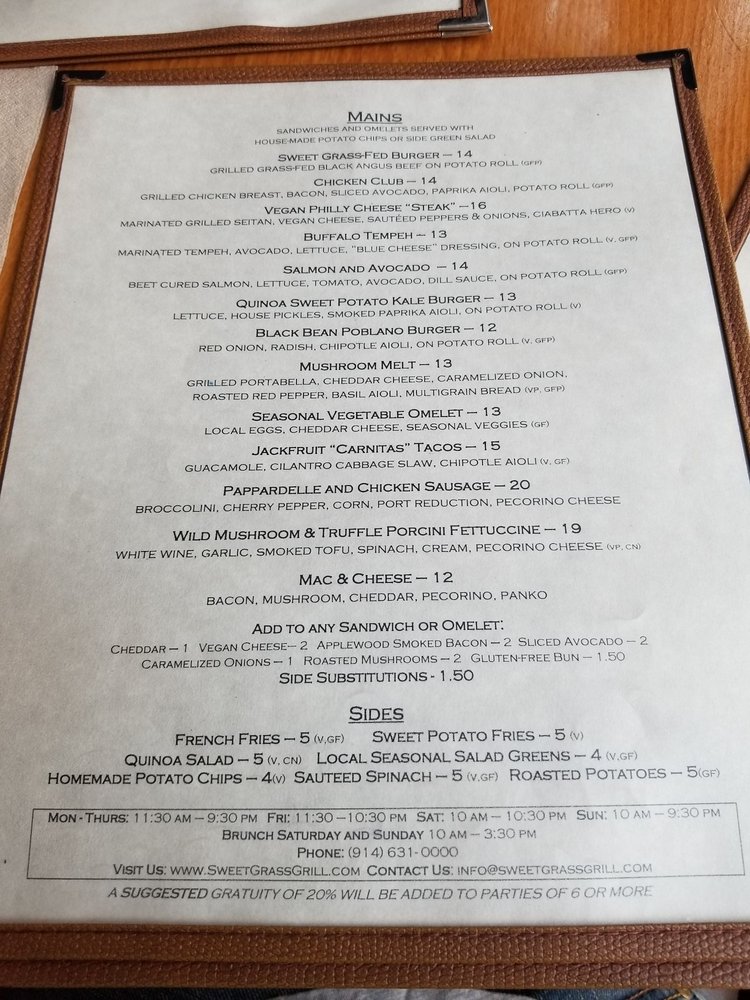 Sweet Grass Grill, located in Tarrytown, NY, is a casual burger and New American cuisine restaurant with an extensive menu that caters to a wide range of dietary preferences. From vegan options like Vegan Mac and Cheese Pasta to classic favorites like the Grass Fed Cheese Burger, there is something for everyone to enjoy. The restaurant offers a welcoming atmosphere with outdoor seating, free Wi-Fi, and gender-neutral restrooms. Whether you're looking for a spot for brunch, lunch, or dinner, Sweet Grass Grill is a great choice with its diverse menu and friendly service. Don't miss the Butternut Squash Soup or the Quinoa & Sweet Potato Burger for a healthy and satisfying meal. Overall, Sweet Grass Grill is a great spot for a delicious meal with friends and family in a relaxed setting.